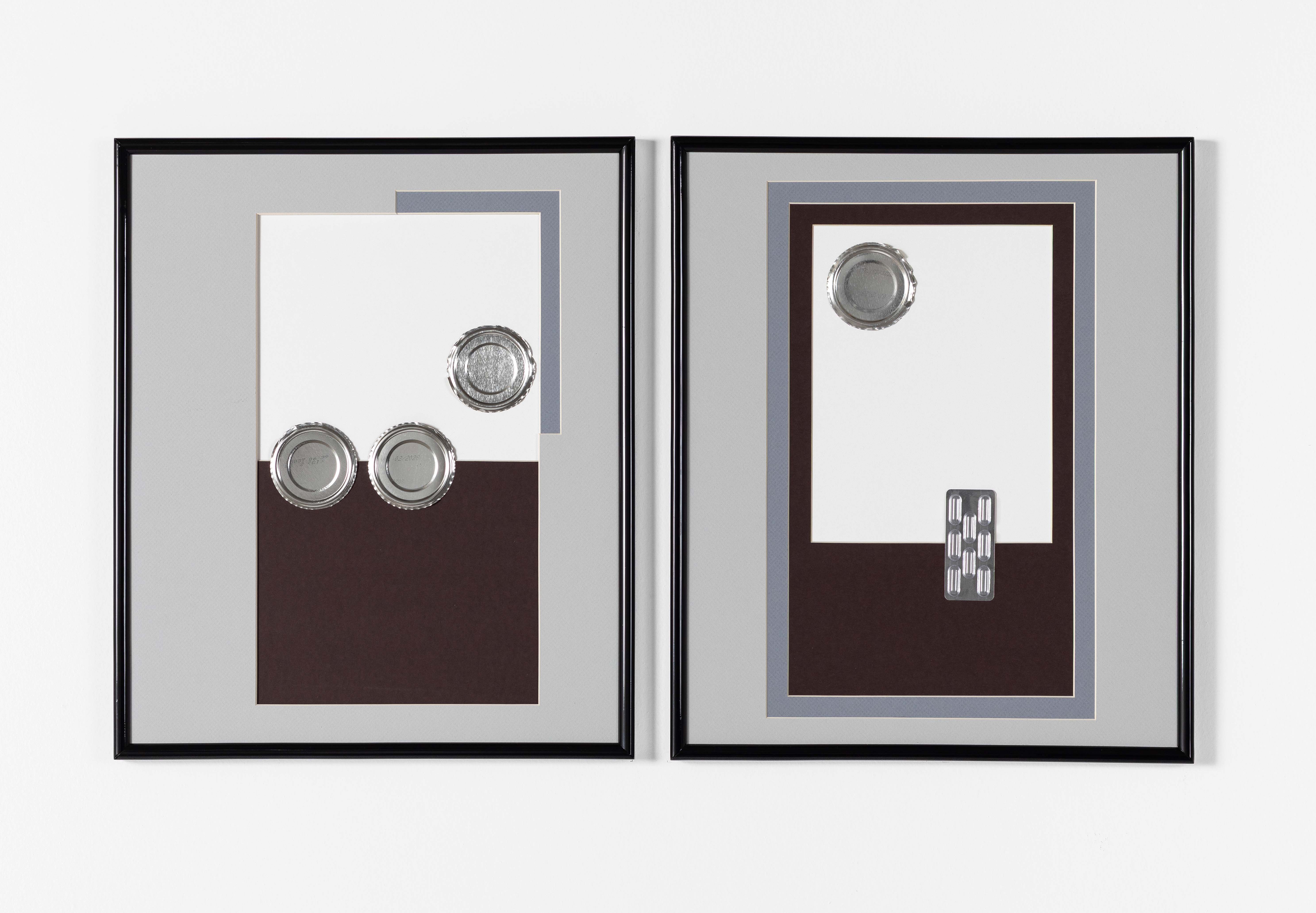 Aluminum can, cotton paper, synthetic paint, medication blister pack, eggshell, resin, and screw mounted on passe-partout, in alacquered wooden frame