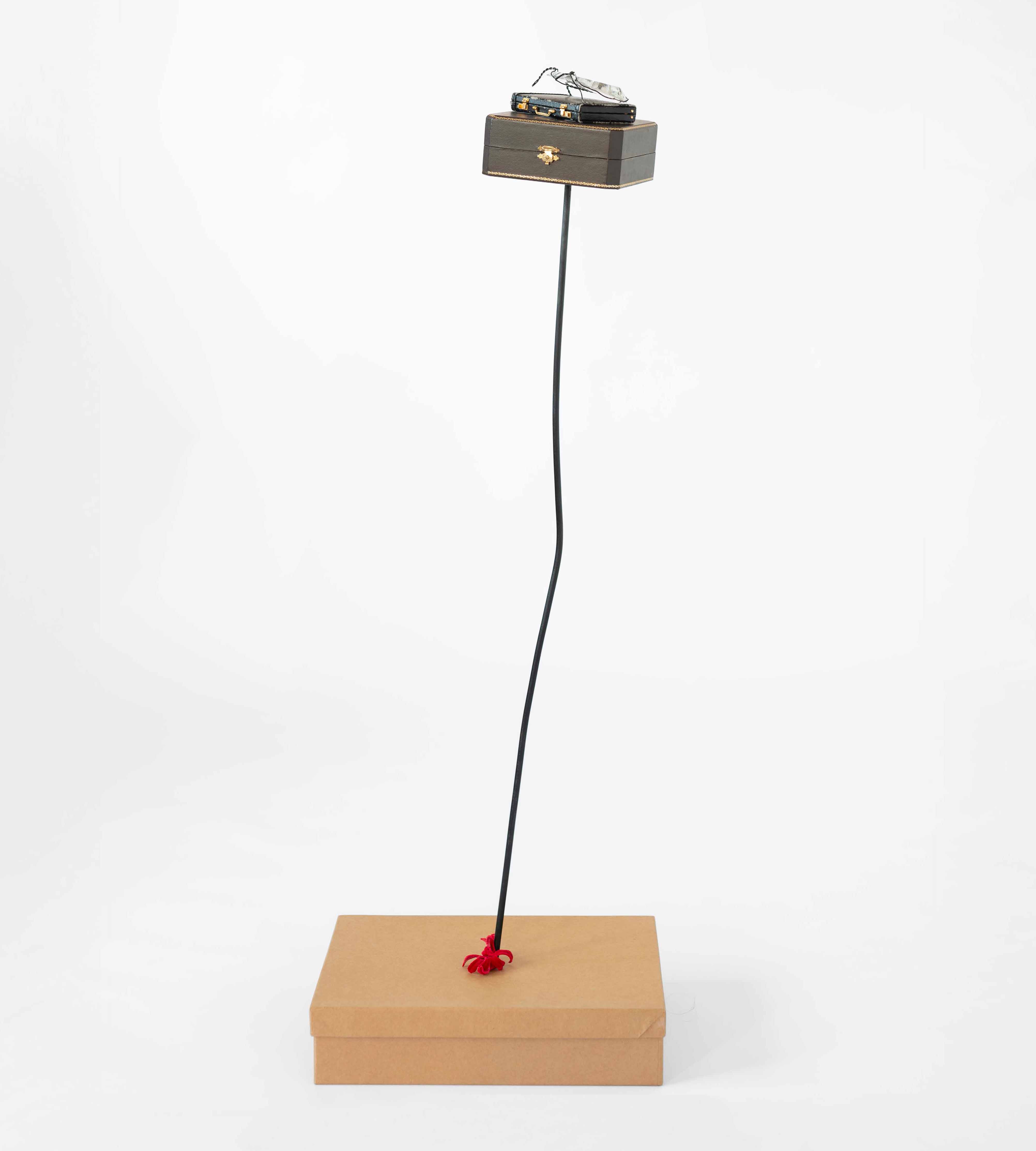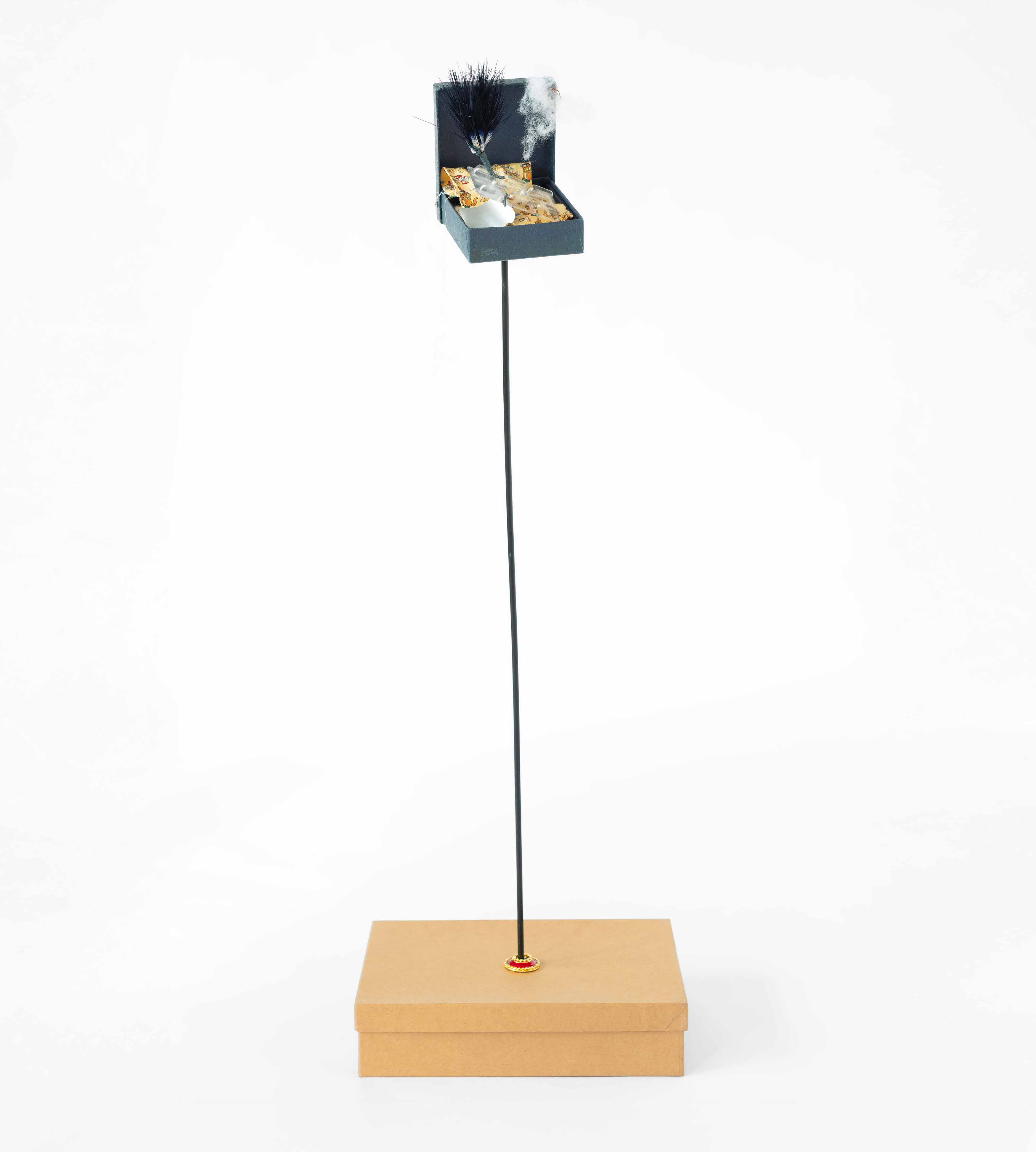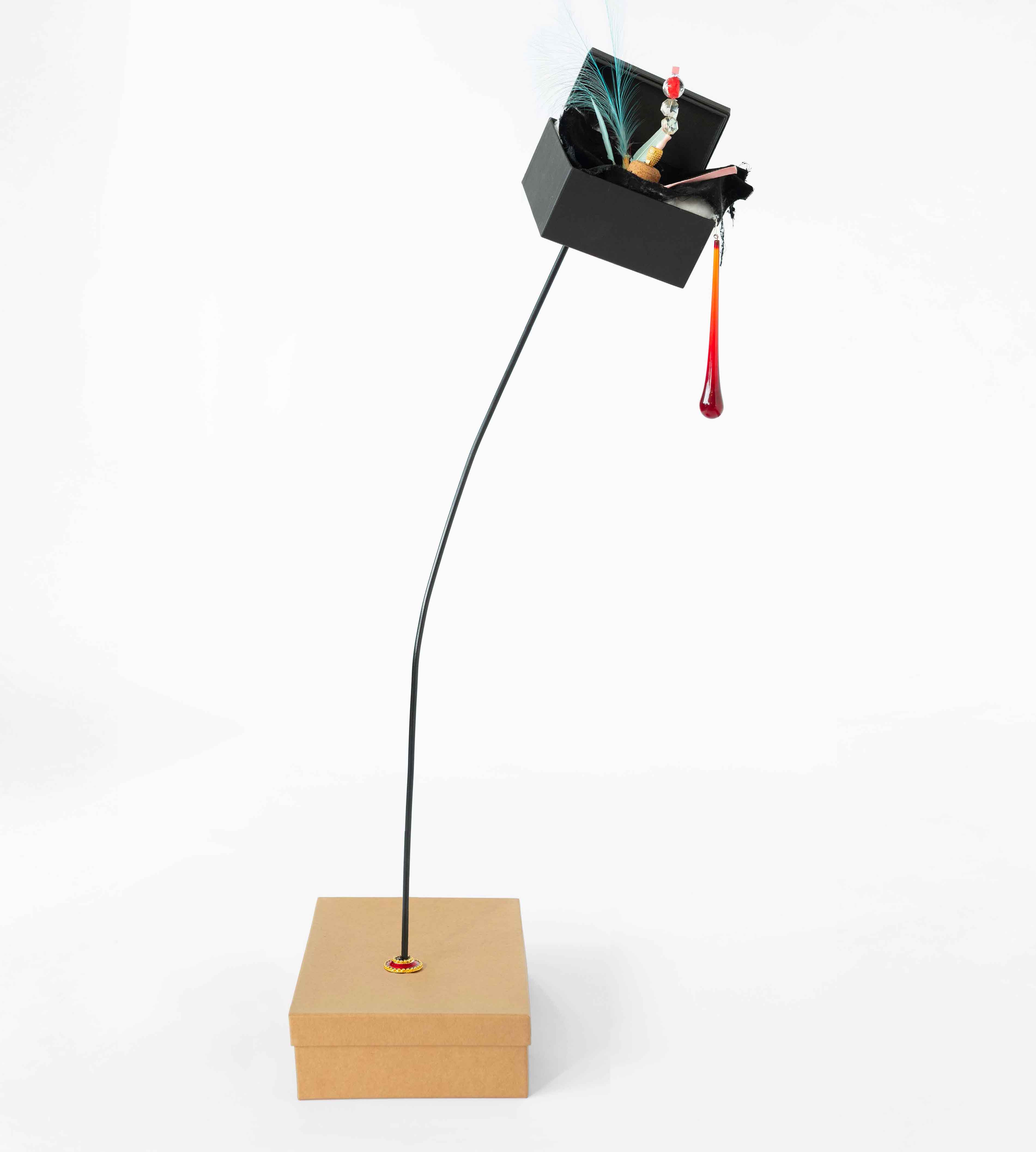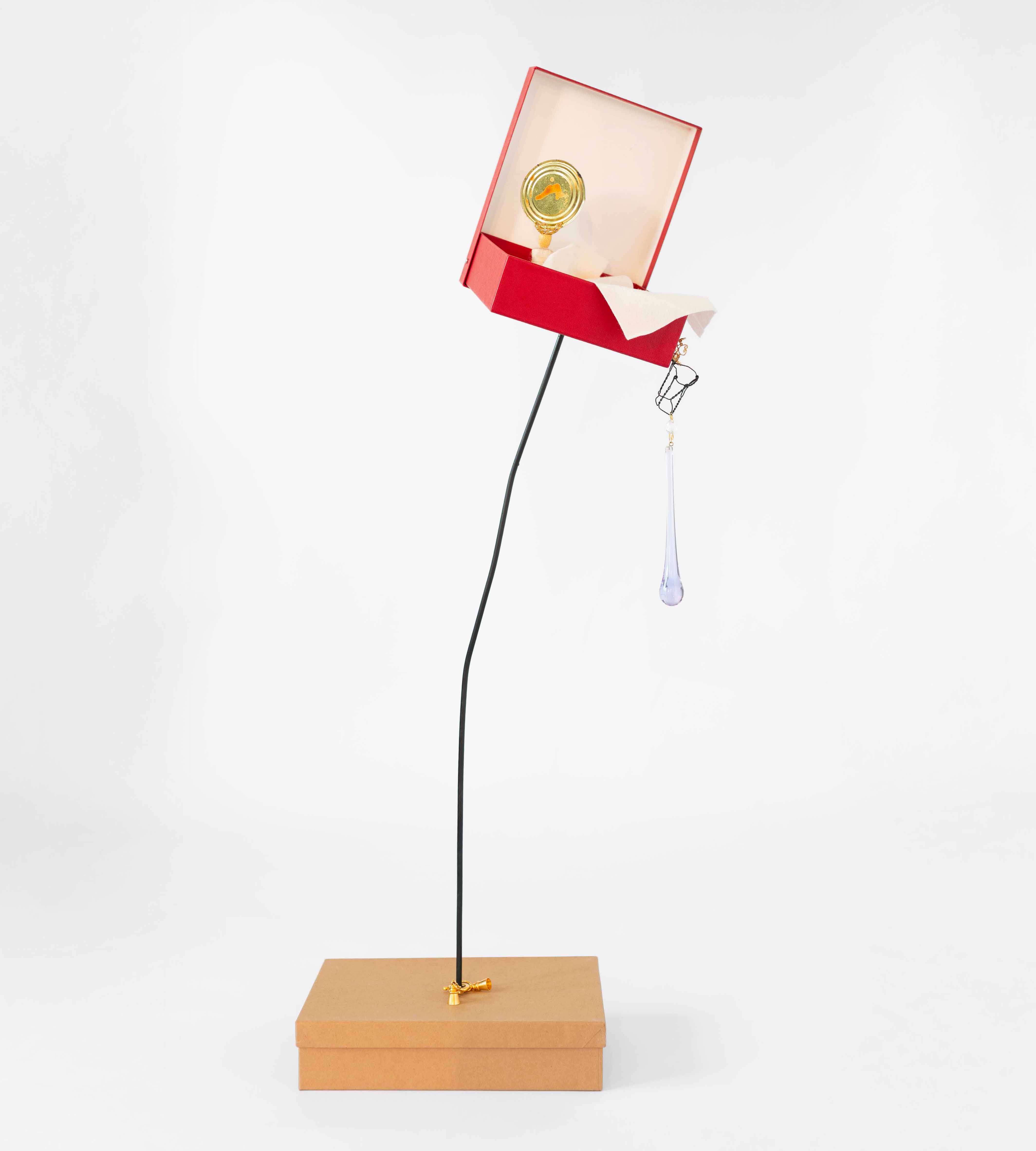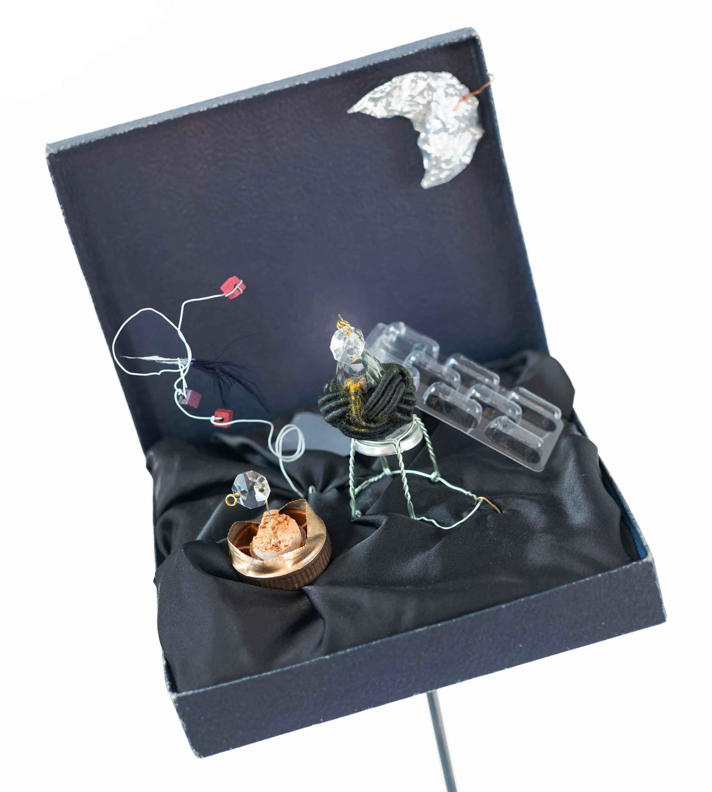 Caja de cartón kraft, caja de joyería, accesorio plástico, cristal, muselet, tela, hierro y pintura sintética.