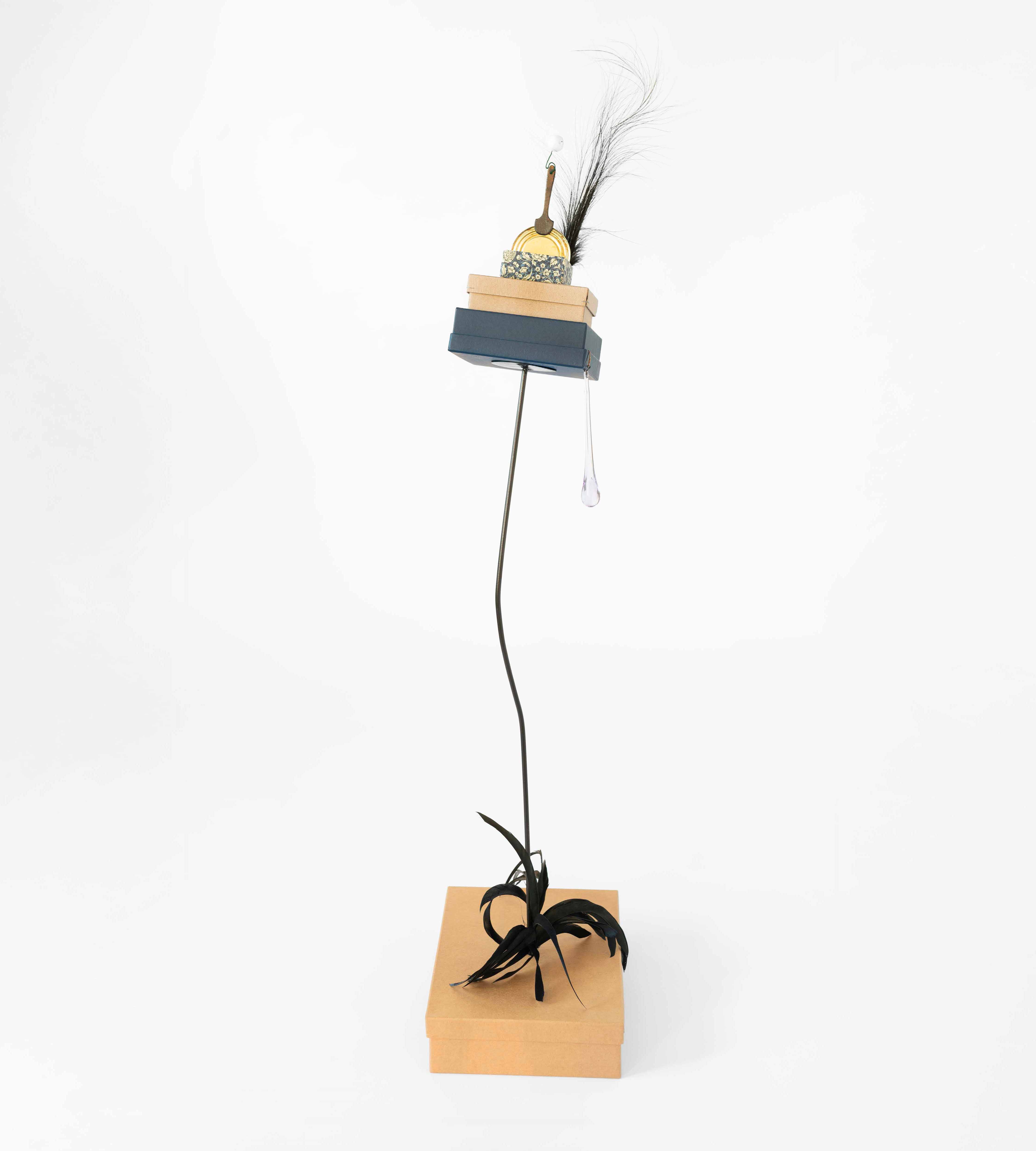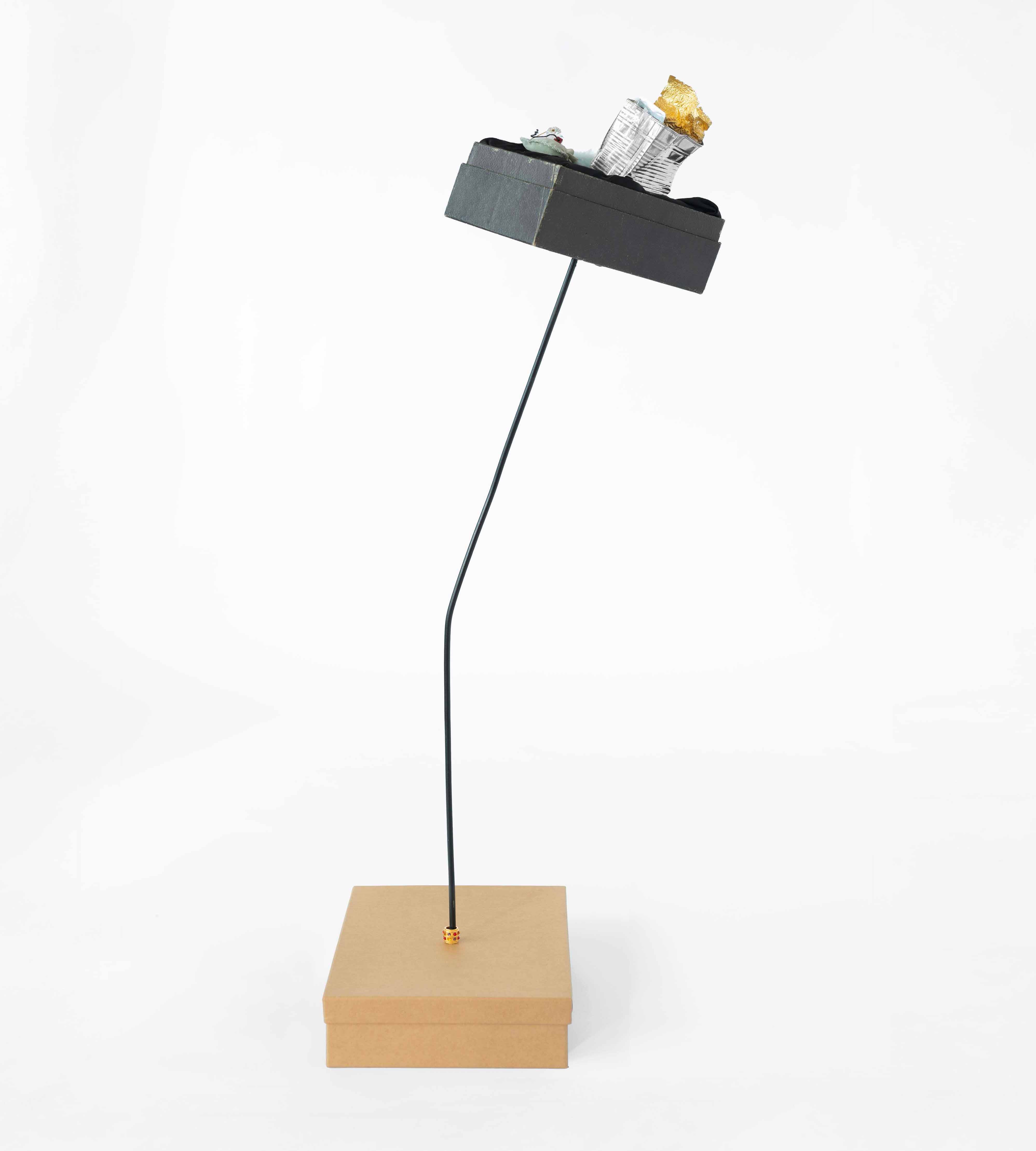Cajas de cartón kraft, papel, cuchara de madera, plumas, cristal, alambre, telgopor, aluminio, hierro y pintura sintética.