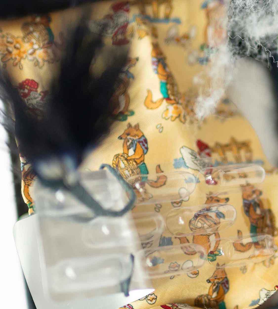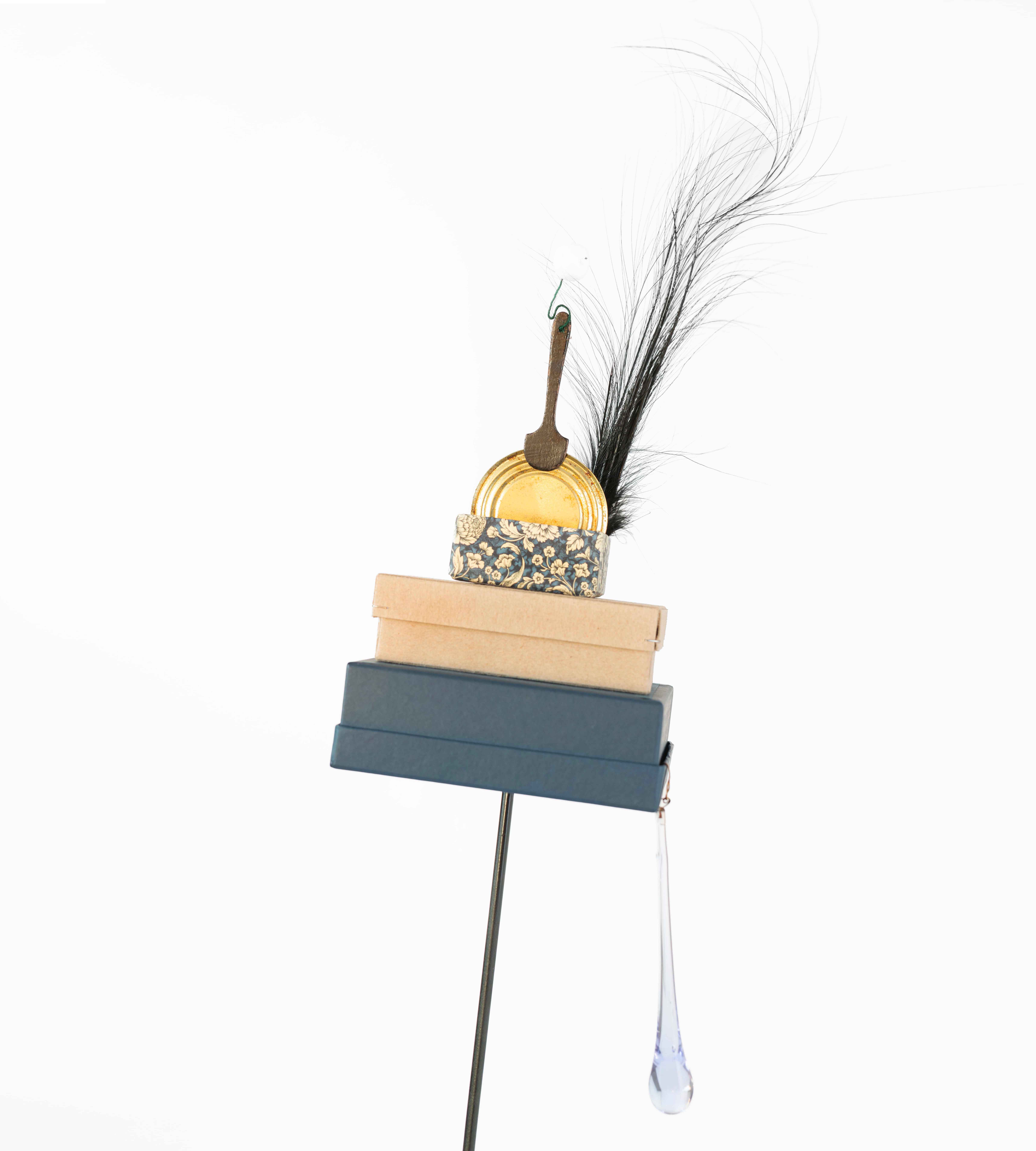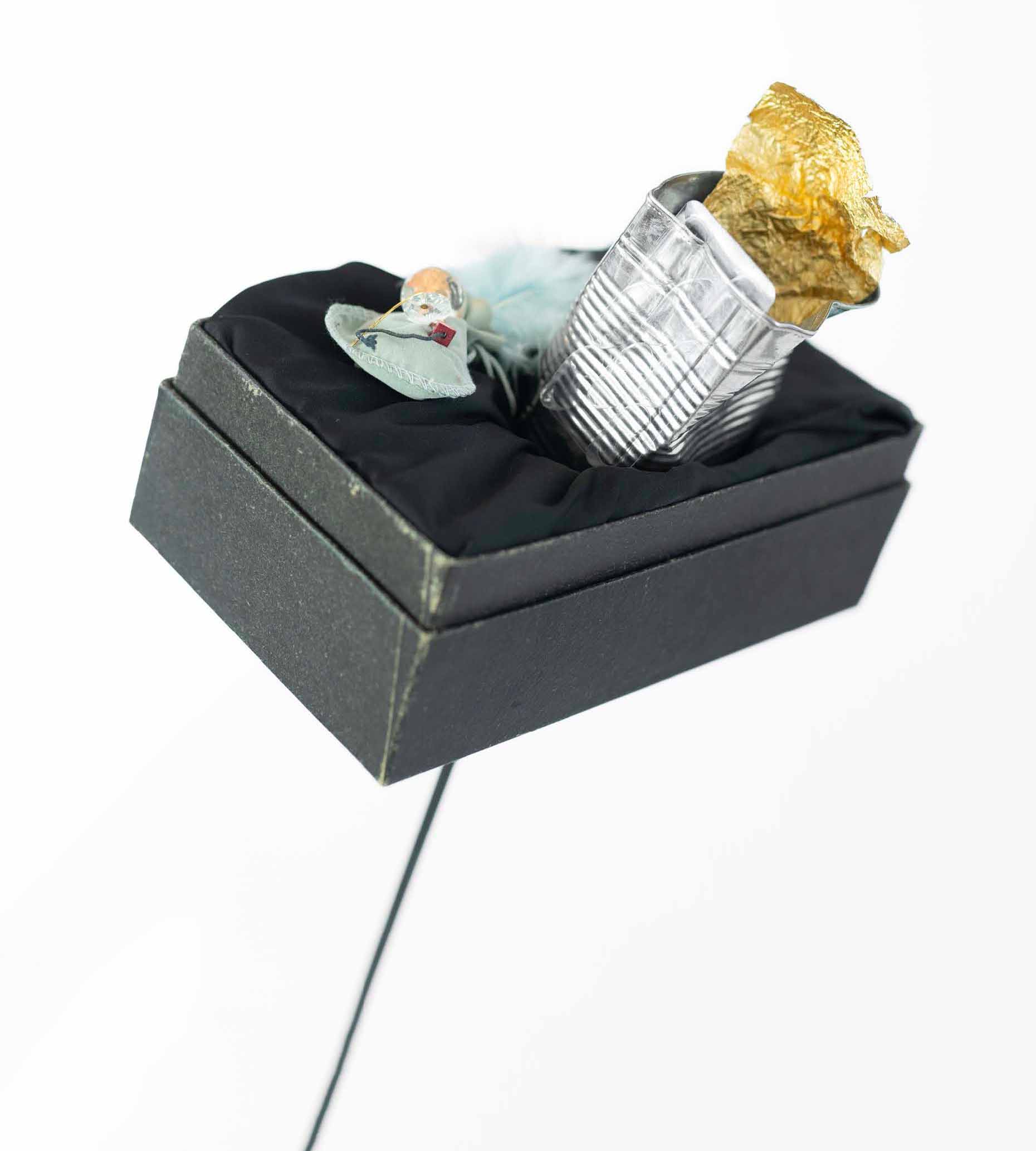 Caja de cartón kraft, caja de joyería, algodón, seda, plumas, blister de medicamento, bijouterie, guata, hierro y pintura sintética.