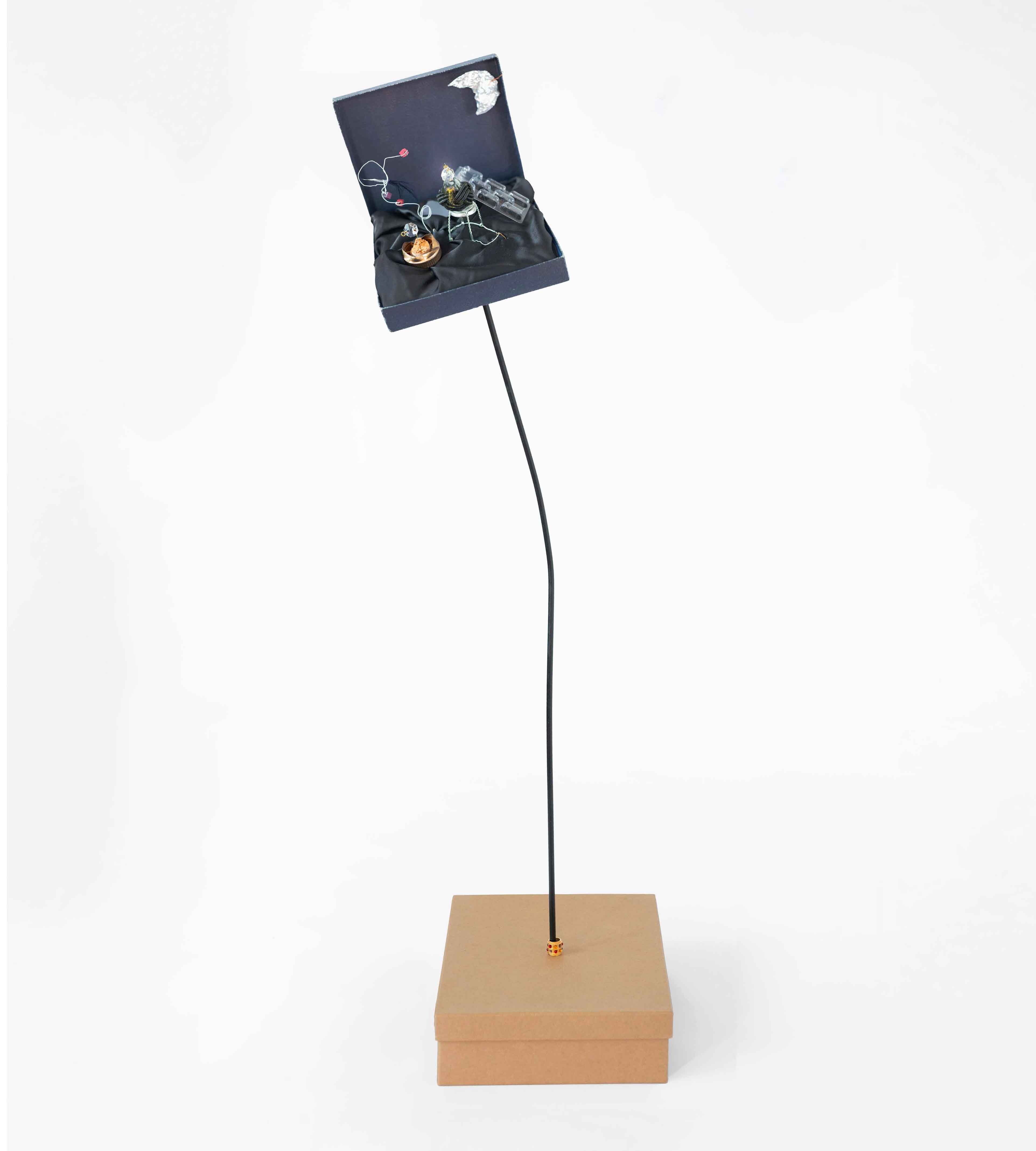 Caja de cartón kraft, caja de joyería, servilleta de papel, cuenta de vidrio, alambre, tela, hierro y pintura sintética.