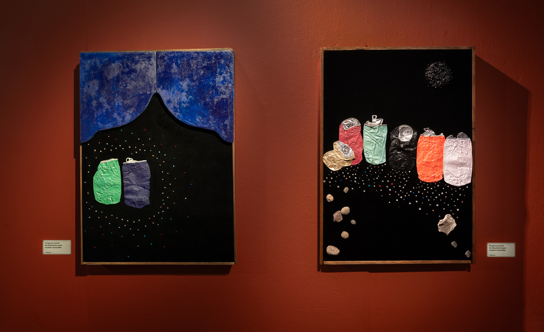 Latas de aluminio, esmalte, acrílico, aritos de strass, pana y piedras con marco de madera.