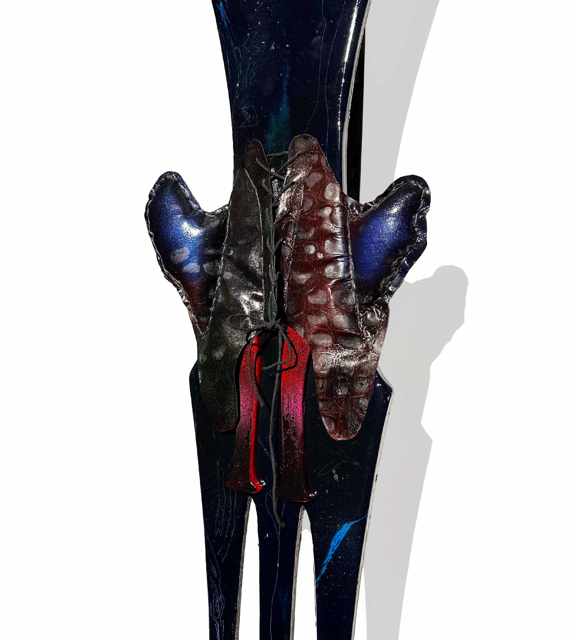 Madera, aerosol, laca, cuero vacuno, cuero sintético, hilo encerado, vellón, plástico y metal